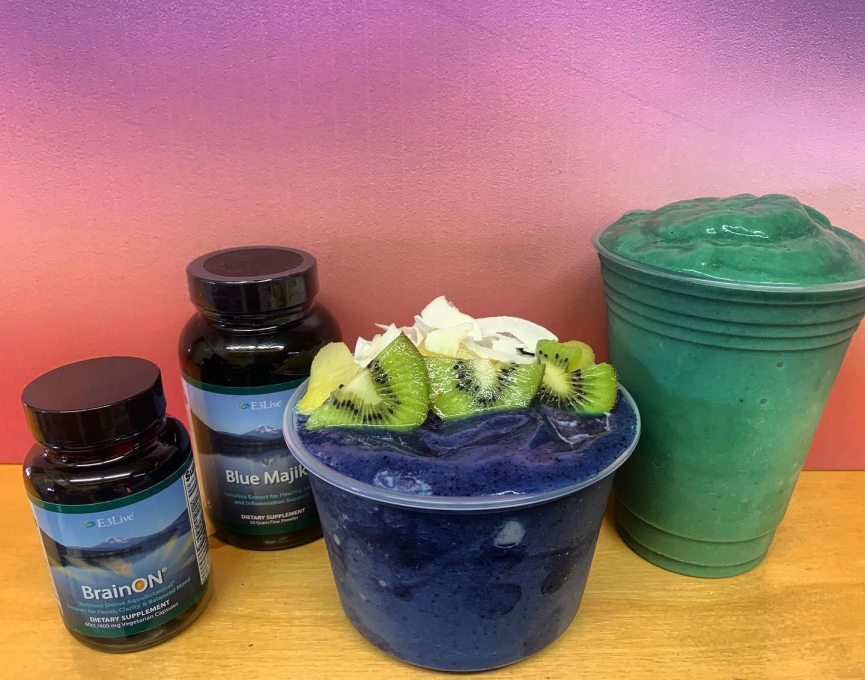 Mermaid: apple juice, mangom pineapple, banana, blue majik powder