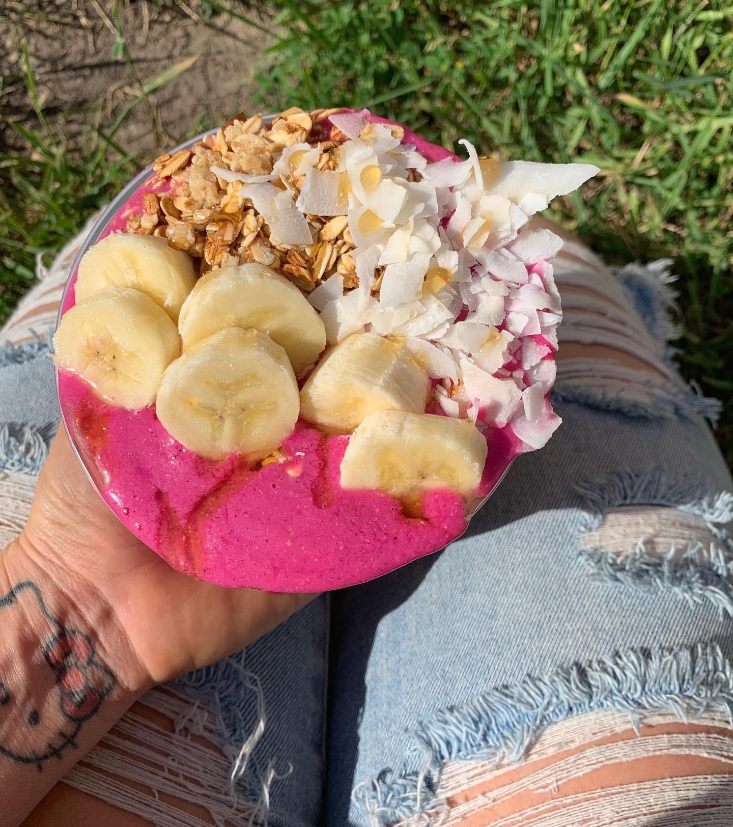 Dragon's Breath: apple juice OR coconut water, pitaya, banana, strawberry, pineapple